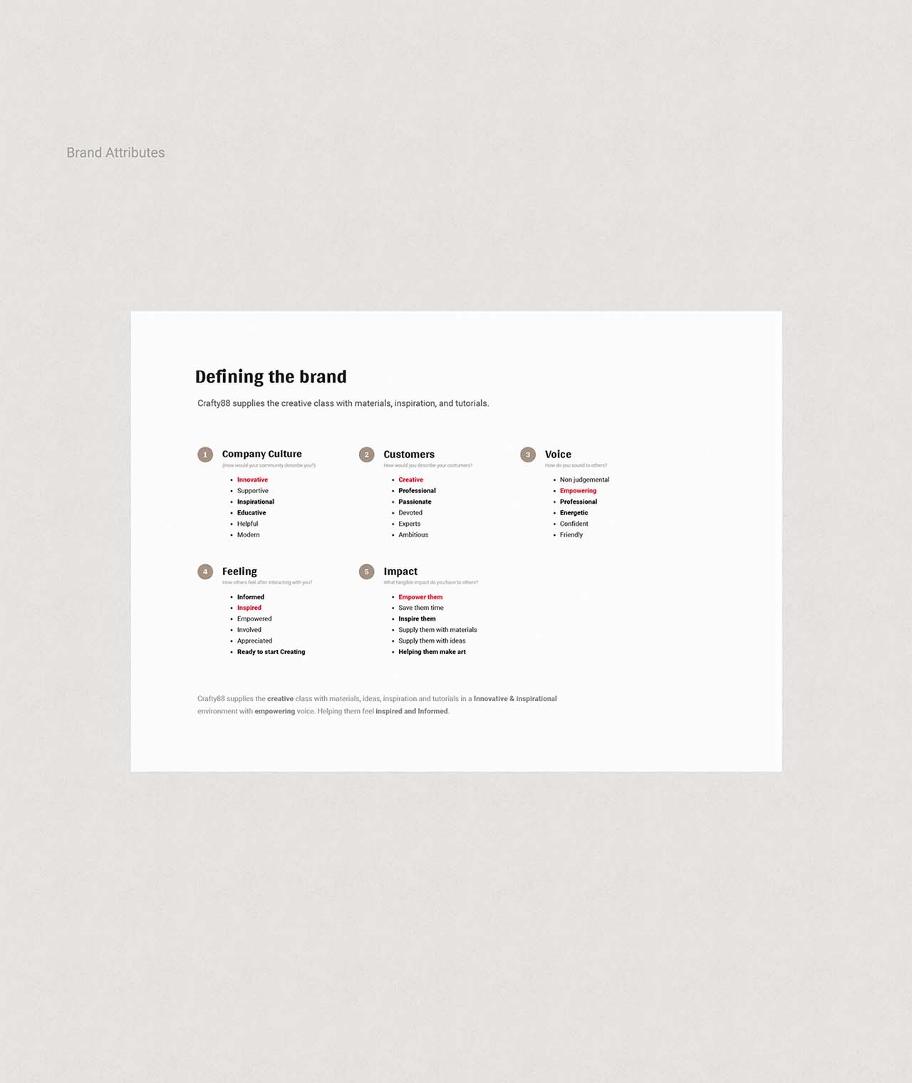 “無論你是畫家,雕塑家,剪貼簿師還是建筑師,你總是從空白的畫布開始,用你的想象力填寫它”Crafty88真的是關于這一點,是藝術家的起點和工具。在我們為此項目設定目標后,我們概述了理想的用戶角色,并定義了品牌屬性。我們努力吸引的客戶是專業藝術家,他們毫不猶豫地使用高質量的工具和材料。