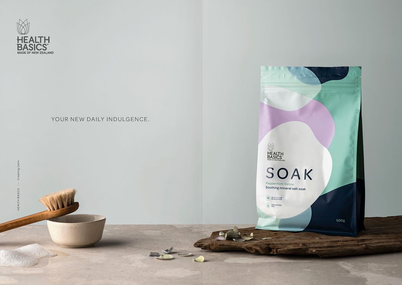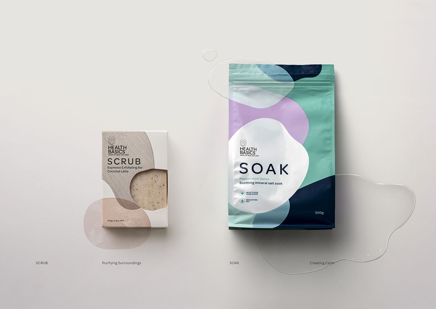 包裝設計公司設計了健康基礎鹽“浸泡” -舒緩礦物鹽品牌。Health Basics希望在其產品系列中引入兩種新產品:沐浴露和沐浴鹽。如您所料,品牌和直通在這兩個類別中都起著舉足輕重的作用。